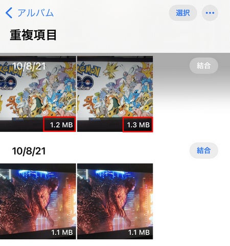 2、表示が完了したら「結合」をタップして重複した写真の結合処理を開始します。最も高品質な写真だけが残るので心配不要です。削除された写真は「最近削除した項目」に移動されます。