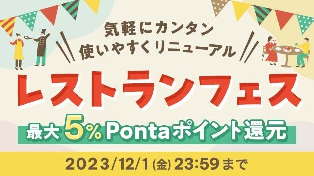 さらに新たな支払い方法の提供開始を記念して、2023年11月1日から12月1日までの期間中、購入金額の最大5%のPontaポイント(au PAY マーケット限定)を還元する「気軽にカンタン 使いやすくリニューアル レストランフェス」を実施します。実施中のキャンペーンや特典とあわせて最大12%のポイント還元となります。