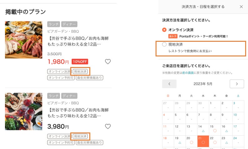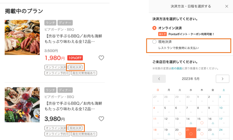 現地決済は、これまで提供してきたオンライン決済(事前決済)に加えて、レストランの飲食時に現地での決済が可能になります。