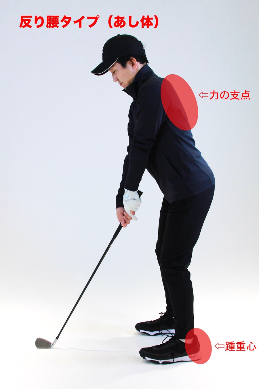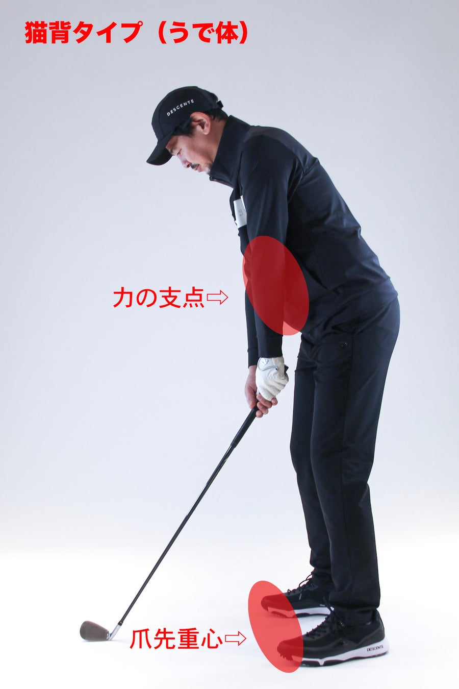 首が前にでて、目線も下を向きやすいため前重心になりやすいのが特徴です。