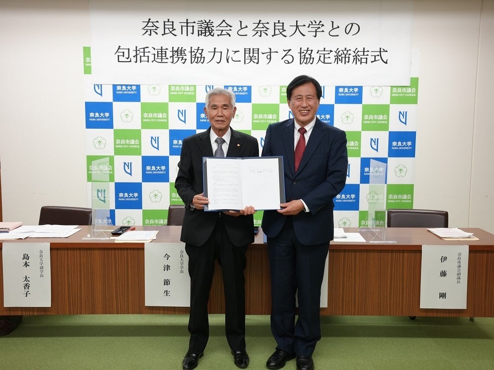 奈良市議会と奈良大学は、包括的な連携の下、市議会の政策形成及び調査・研究に関することや、大学の人材育成及び教育・研究に関することで相互に協力し、地域社会の発展及び人材育成に貢献することを目的に「奈良市議会と奈良大学との包括連携協力に関する協定」を締結しました。