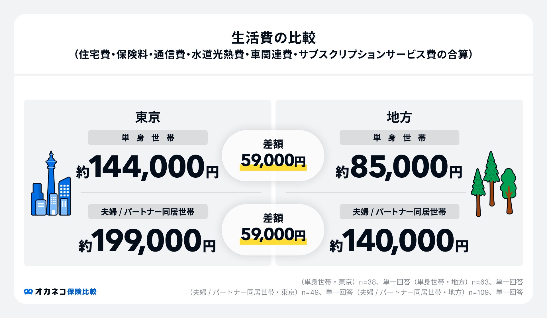 1か月の生活にかかるお金(住宅費・保険料・通信費・水道光熱費・車関連費・サブスク費)を調査したところ、単身世帯では東京:約144,000円、地方:約85,000円、夫婦/パートナー同居世帯では東京:約199,000円、地方:約140,000円という結果となり、どの世帯構成においても5~6万円の開きがあることが分かりました。