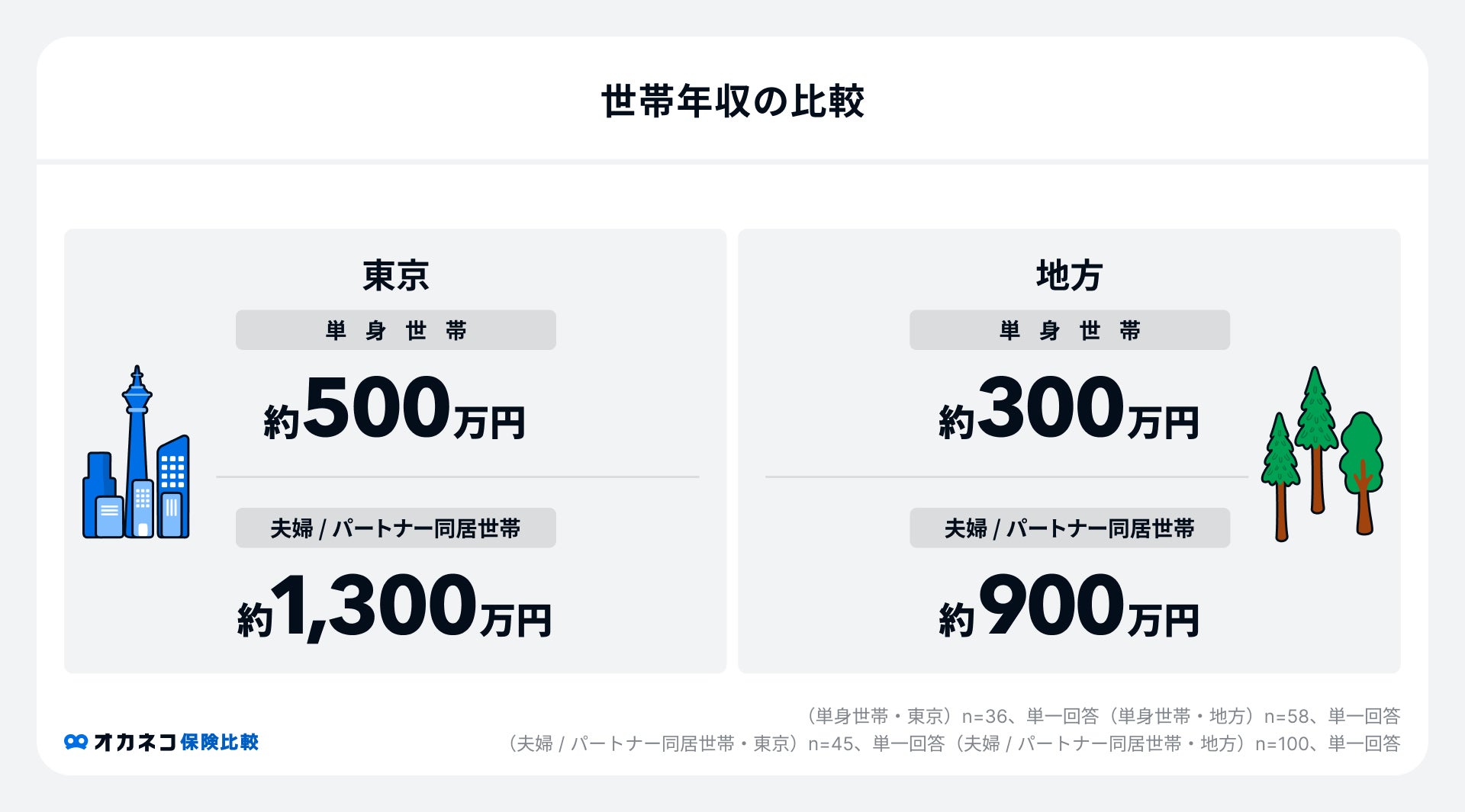 単身世帯では東京は約500万円、地方は約300万円、夫婦/パートナー同居世帯では東京は約1300万円、地方は約900万円という結果となり、やはり東京のほうが高水準であることが分かりました。