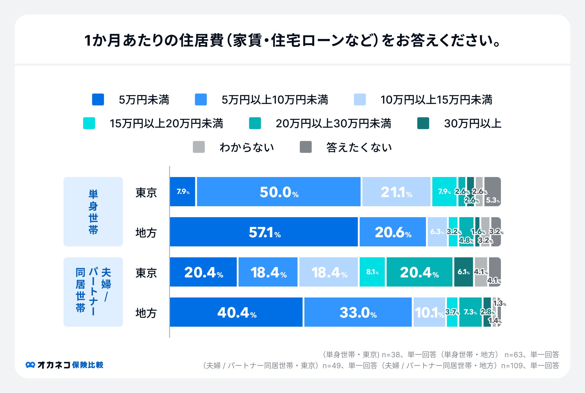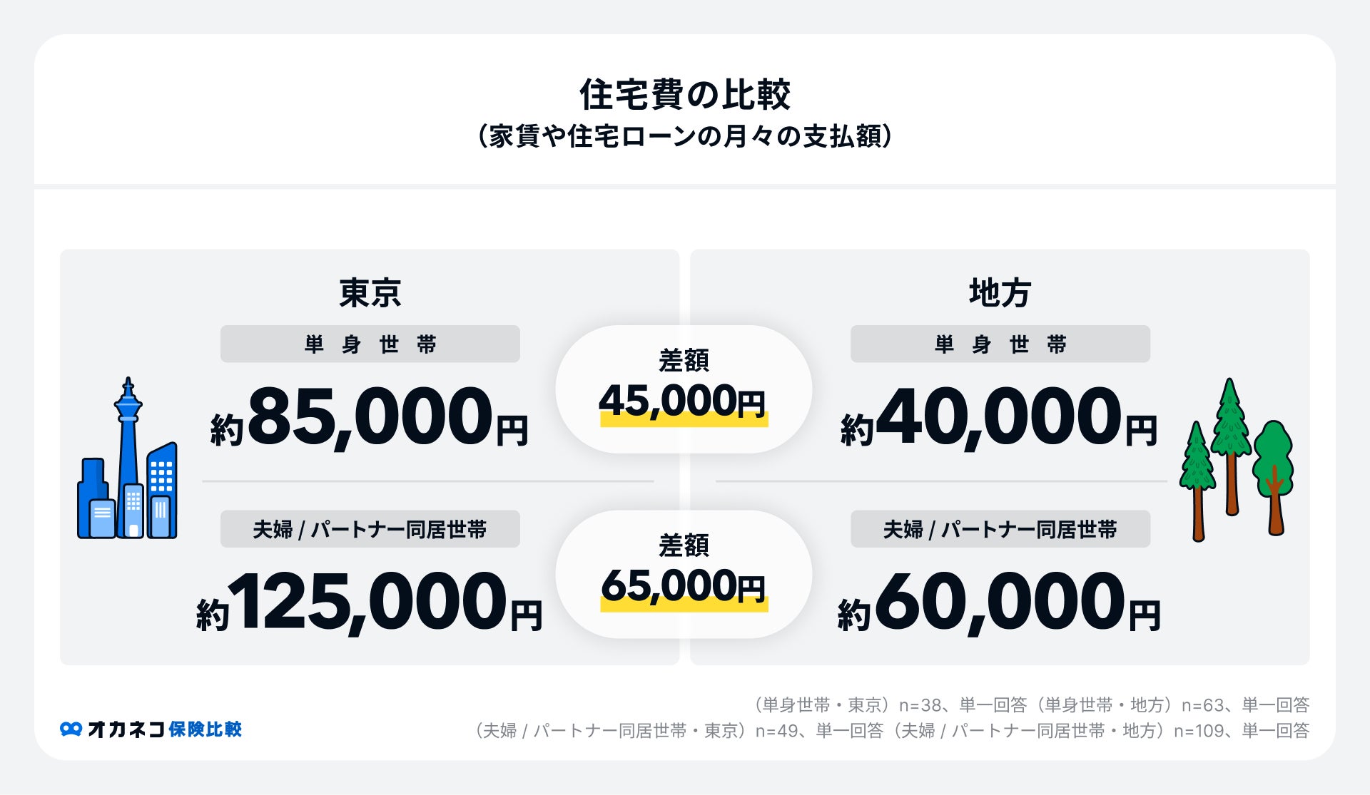 調査対象となる「生活費」内訳のうち、住宅費(家賃・住宅ローン)が最も大きな違いを生んでいることがわかりました。単身世帯の住宅費は東京が約85,000円に対して地方は約40,000円、夫婦/パートナー同居世帯では東京が約125,000円に対して地方は60,000円でした。