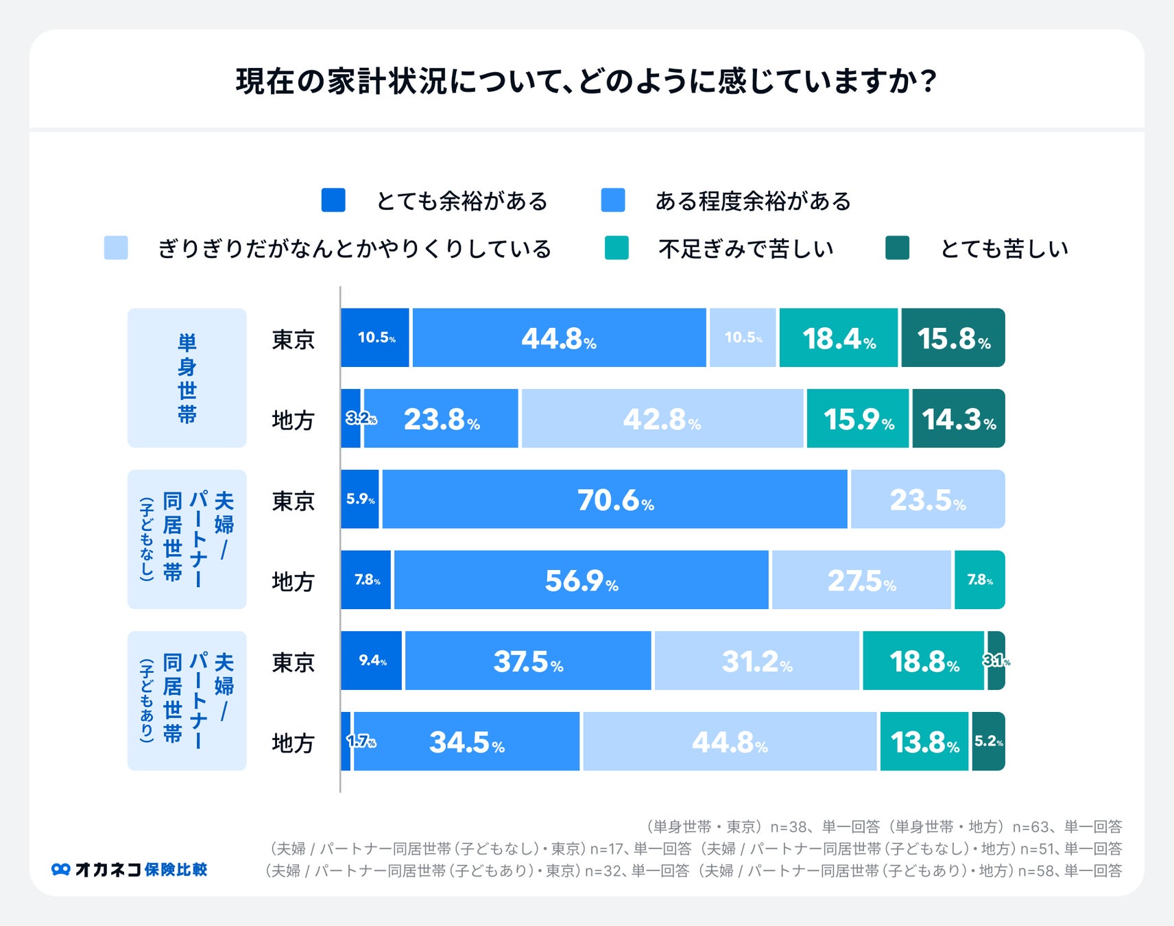 全世帯構成を通して、東京に住む世帯のほうが余裕があると感じている人が多いことが分かります。一方で、単身世帯と子供有り世帯においては「苦しい」と感じている人も一定数おり、「苦しい」と感じる層と「余裕がある」と感じる層に二極化していることが分かりました。