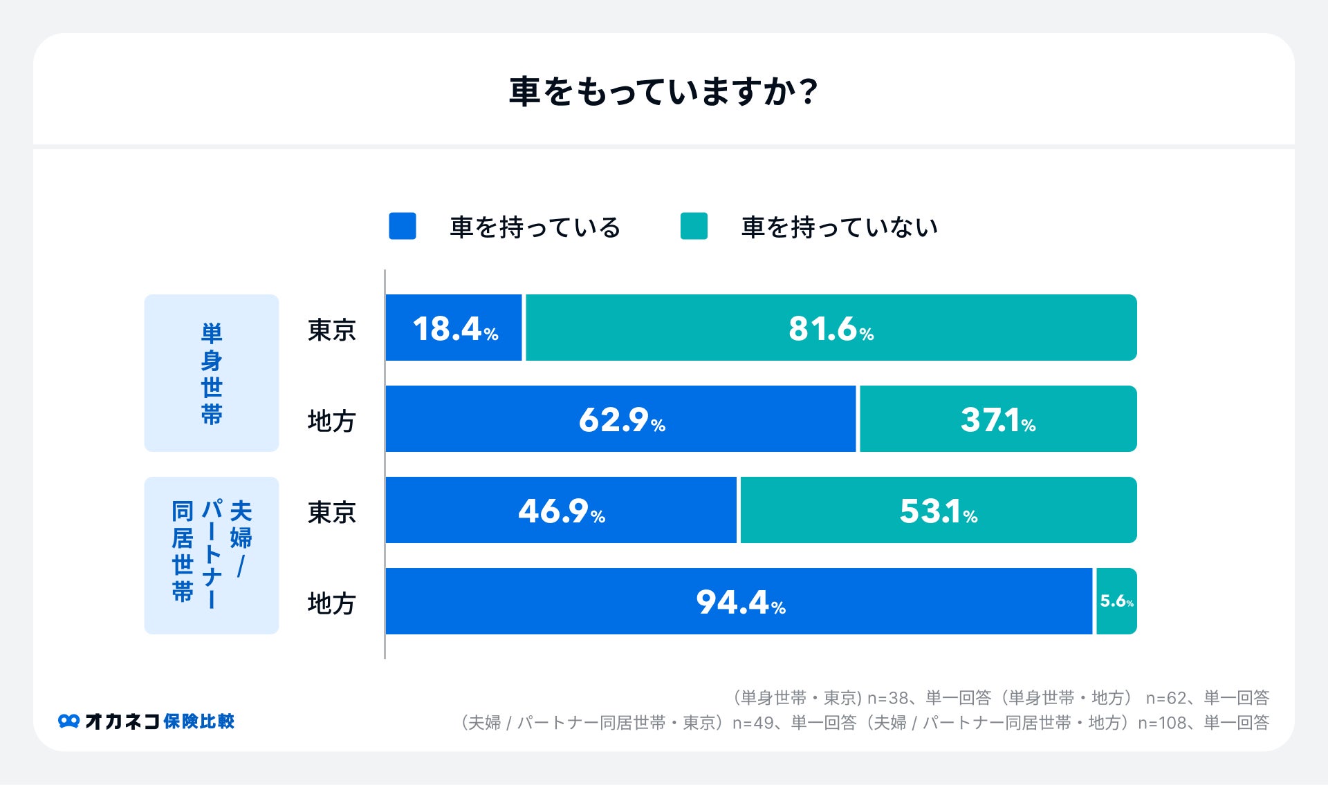 地方のほうが負担が大きいのが車関連費用。単身世帯の車所有率は東京が18.4%・地方が62.9%、夫婦/パートナー同居世帯は東京が46.9%・地方が94.4%という結果となり、地方ではほとんどの方が車関連の費用を支払っているようです。車所有者の月々の支払額は東京で約25,000円、地方で約15,000円でした。