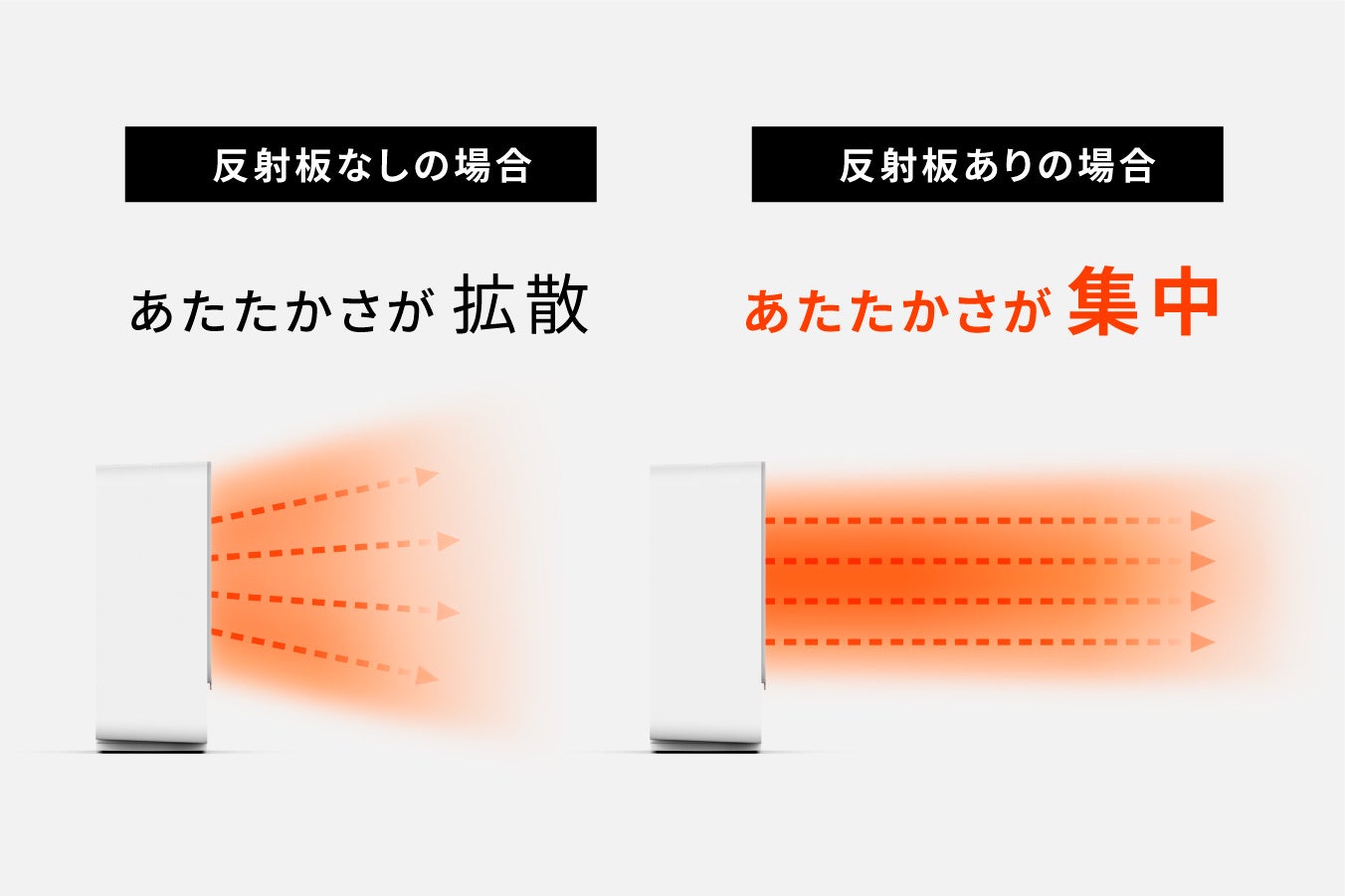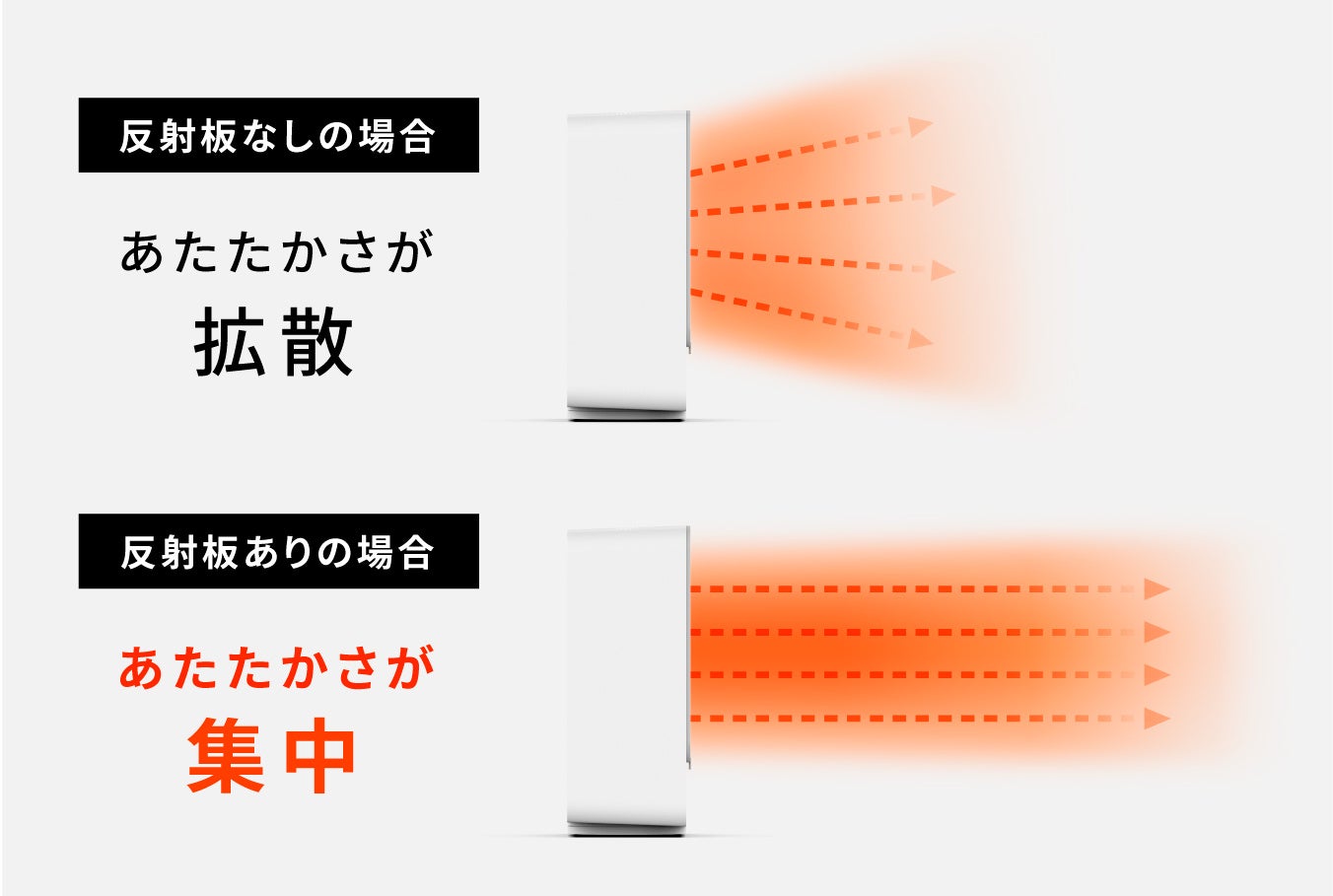 1.あたたかさ2倍で省エネ。「反射板×ファン」の独自構造であたたかさ広がる
