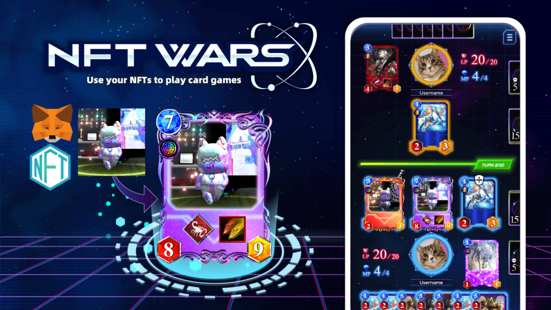『NFTWars』は、手軽にNFTプロジェクトにゲームのユーティリティを付与できるサービスです。ユーザーはウォレットで所有するNFTを使用し、様々なNFTプロジェクトのカードゲームで遊ぶ世界の実現を目指します。