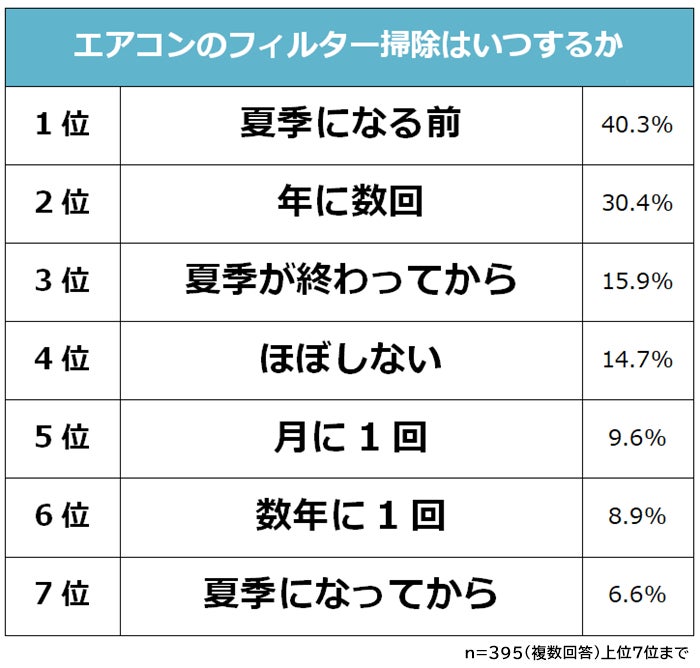 最後に「エアコンのフィルター掃除はいつするか」を複数回答で聞いたところ、1位は「夏季になる前(40.3%)」でした。本格的にエアコンを使い始める前に掃除をして、気持ちよく使いたいと考える人が多いようです。