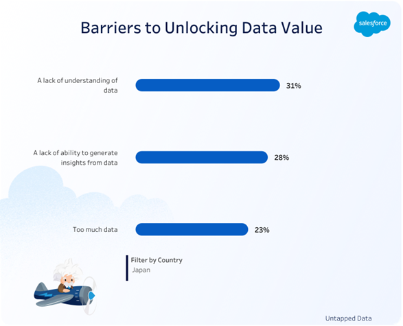 株式会社セールスフォース・ジャパン(本社:東京都千代田区、代表取締役会長 兼 社長:小出 伸一、以下、Salesforce)は、日本のビジネスリーダー1,000人以上を対象とした調査「Untapped Data Research」を、Tableau事業の一環として実施しました。これにより、ビジネスリーダーは、データ活用がビジネスにとって重要であると認識しているものの、大多数がより良い意思決定とビジネスの成果を得るためにその力を活用できていないことが明らかになりました。