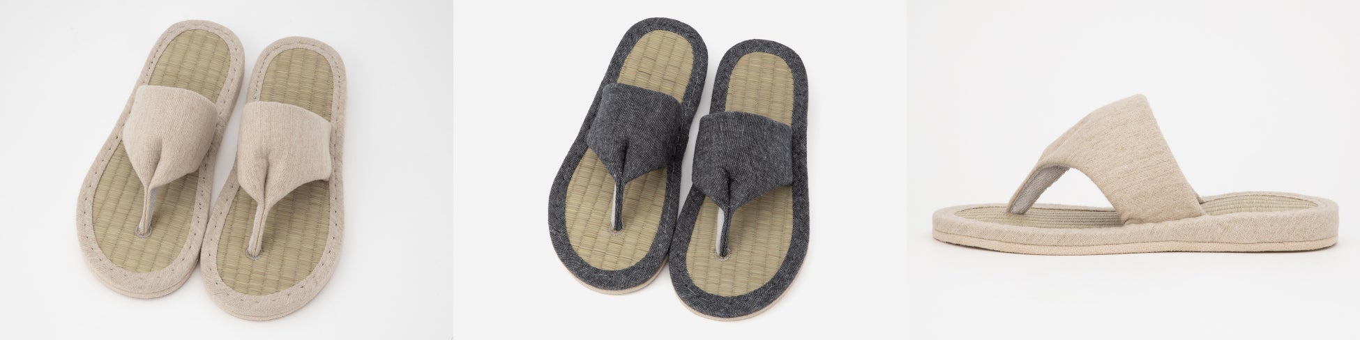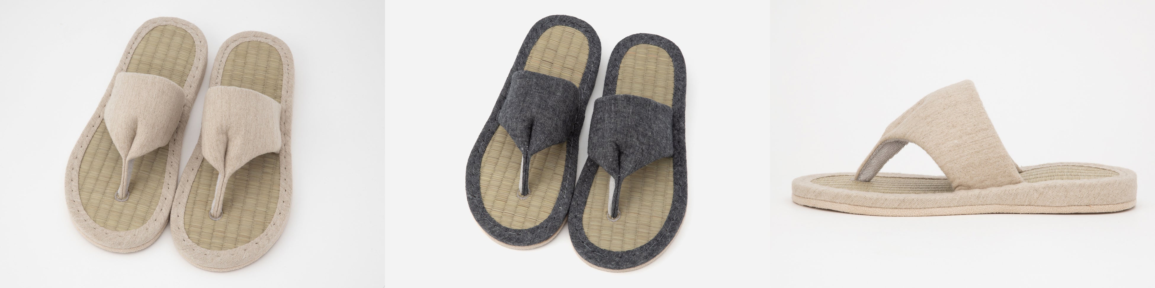 通気性の良さとさっぱりした履き心地が特徴のスリッパ。今年の畳スリッパは、鼻緒付きの草履のフォルムで登場。指の間を刺激しつつ肌当たりがやさしく履きやすいです。