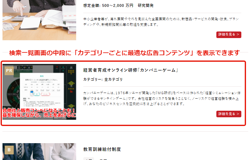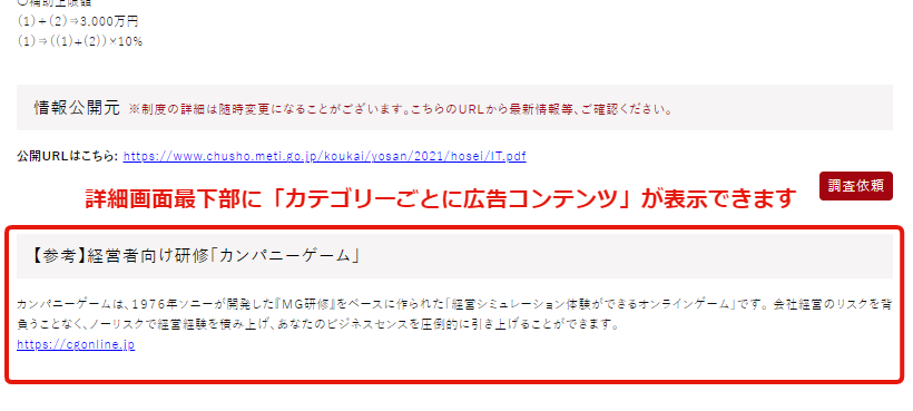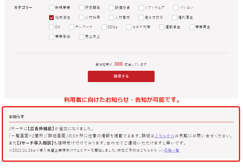 導入する企業さまにとっては、自社サイトにJサーチを設置することにより、広範な顧客支援を実現することが出来ます。また、新たに実装した広告機能を活用することで、補助金・助成金と自社サービスを関連づけて問合せを集めることが出来るようになります。