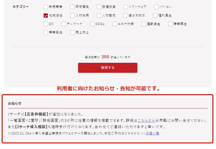株式会社ライトアップ(本社:東京都渋谷区、代表取締役社長:白石崇、以下ライトアップ)は、2022年4月より提供を開始した「Jサーチ(補助金・助成金検索システム)」に新しく「広告機能」をリリース致しました。
