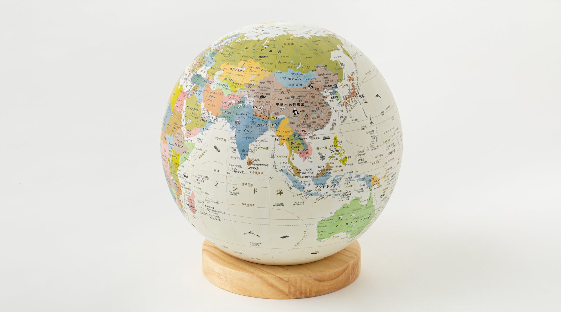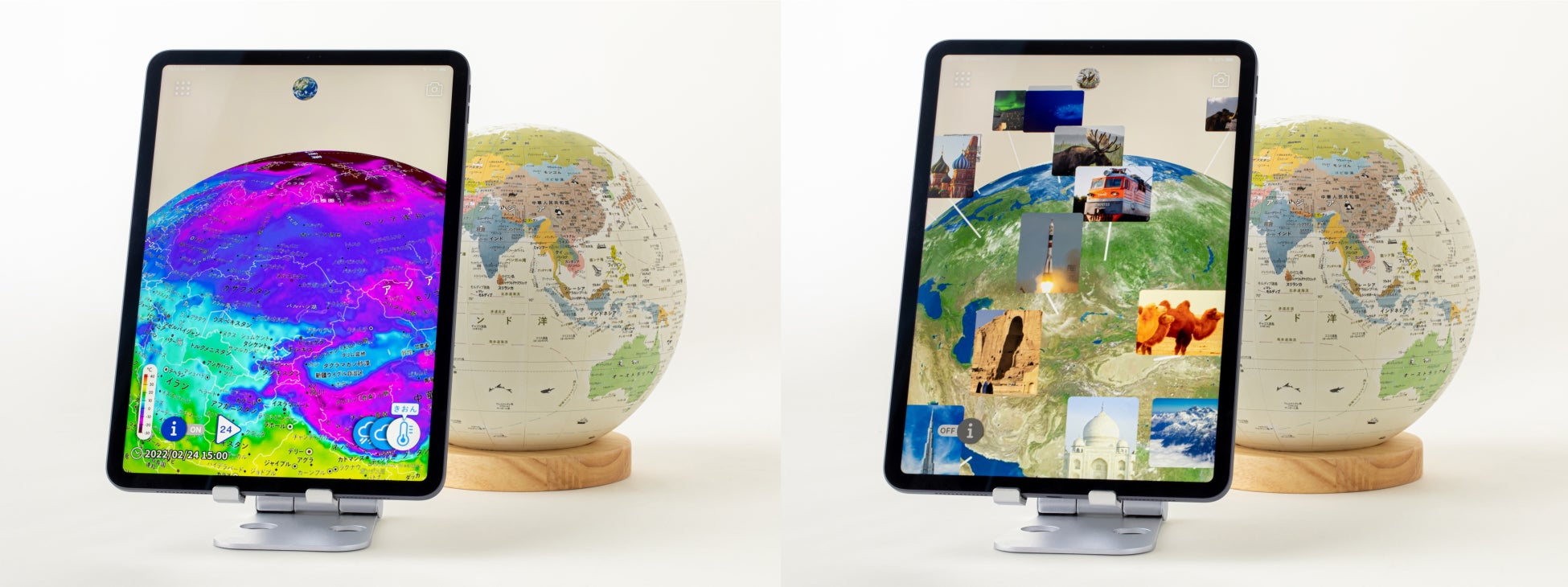 今回加わる新モデル「ジャーニー」は、メインモデルよりひとまわり大きい直径20cmで、世界の国をカラフルに色分けした地球儀です。ナチュラル色の木製台座付きで、軸がないので手に持ち上げてながめることもできますし、メインモデルと同様にスマホやタブレットをかざすとAR地球儀としてもお使いいただけます。インテリア性もありながら、世界をたのしく学べる実用性も兼ね備えた、最先端の地球儀です。