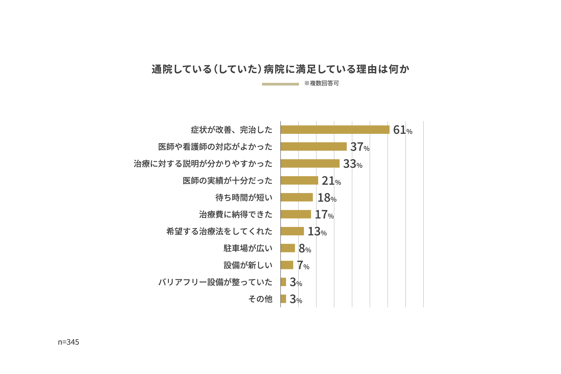 当然、患者にとって症状の改善・完治が最も重要であることは間違いありませんが、「医師や看護師の対応」「治療に対する説明」といったホスピタリティやインフォームド・コンセントの接遇面や、「医師の実績」も受診後の満足度につながることがわかりました。