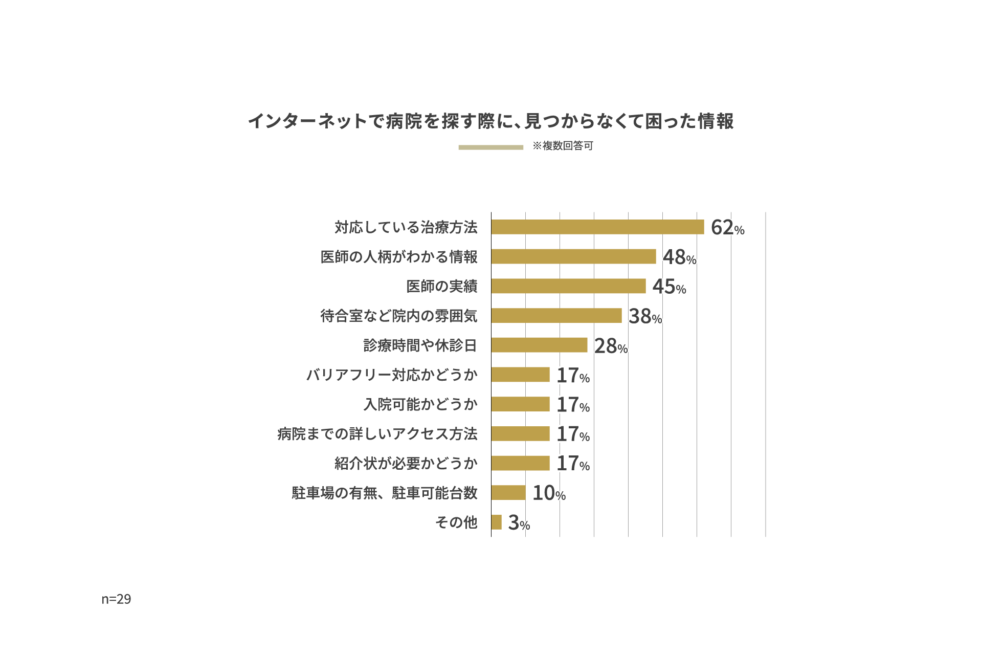 一方で、インターネット検索で病院を探す際、見つからなくて困った情報として挙がったのが「対応している治療法」(62%)、「医師の人柄がわかる情報」(48%)、「医師の実績」(45%)です。