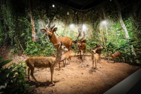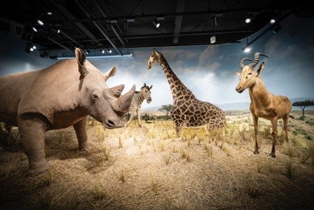 館内にはジオラマ展示と剥製展示のスペースがあり、ジオラマは、シマウマやキリン、シロサイなどが暮らす「アフリカの草原」、高地や丘陵地の森林でボンゴ、オリビなどの生態を再現した「アフリカの森林」、ジャイアントエランドやコーブ、オリックスらのすみかが見られる「岩場のある草原:アフリカ」という3つのゾーンで構成。リアルなジオラマと、まるで生きているかのような動物たちの躍動感が没入感を高めます。