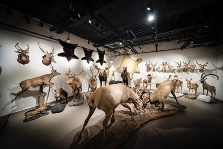 剥製の展示室では角を突き合わせるワピチが中央に陣取り迫力満点。多様な動物が種ごとに展示され、壁面には頭部や毛皮も飾られています。中心となるのはアルタイアリガリ、シベリアアイベックスといったヤギの仲間、ヘラジカ、トナカイなどのシカの仲間ですが、アメリカクロクマやホッキョクグマ、ナイルワニといった捕食者の動物も見ることができます。ジオラマとこの展示には一部の展示物を除いて柵が設けられておらず、動物たちの毛並みや筋肉を間近に見られることが大きな特徴となっています。