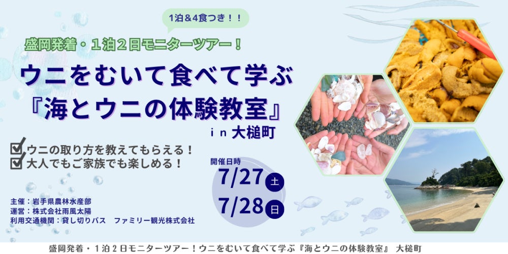岩手県大槌町の吉里吉里漁港で、ウニの殻むきや海遊びなどの体験を通じて海を学ぶモニターツアーです。ウニのとりかた・剥きかたを直接教わりながら、海のことを学ぶ機会を提供します。