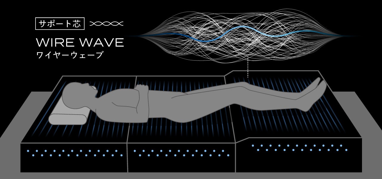 身体の部位に応じて繊維の太さを調節したワイヤー状のサポート芯”ワイヤーウェーブ”がマットレスの内側から線で身体を支えます。体圧の異なる身体の部位を支え、沈み込み過ぎることなく理想の寝姿勢をキープします。