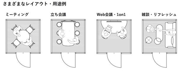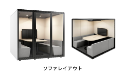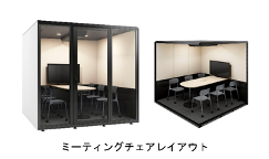 大掛かりな設備工事が不要な「TELECUBE by OKAMURA」シリーズに4~6人で使用可能なシリーズ最大サイズ(2400W×2400D)の多人数用を追加します。ソファやキャスター付きのチェアを使用したレイアウトによるミーティングの他、任意の家具を使用したレイアウトで立ち会議やプレゼンテーション、マネージャー室などの個室、休憩スペースなどさまざまな用途で使用可能です。内装の色仕様やオプションも追加品ぞろえし、設置空間や用途、内装家具に合わせてコーディネートすることができます。