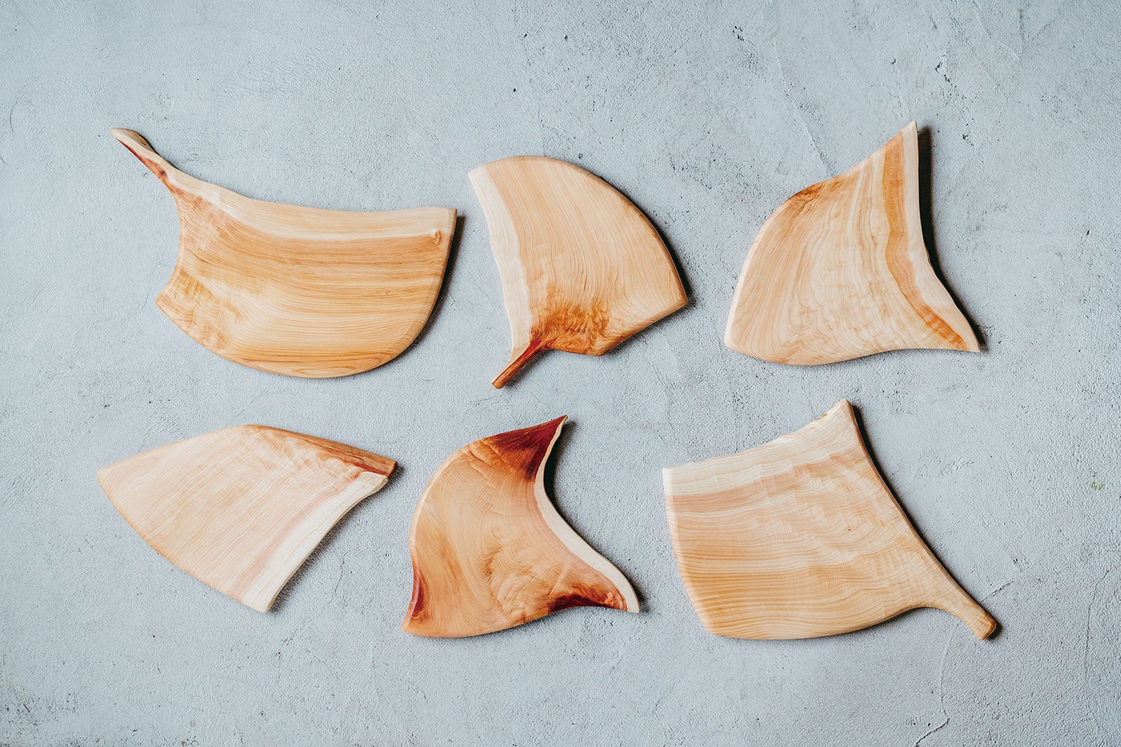 製材所で出た建築材に適さない癖のある自然木(杉やヒノキなど)を、世界に一つだけのカッティングボードとしてアップサイクルした、個性豊かな天然木のカッティングボード約100点を販売