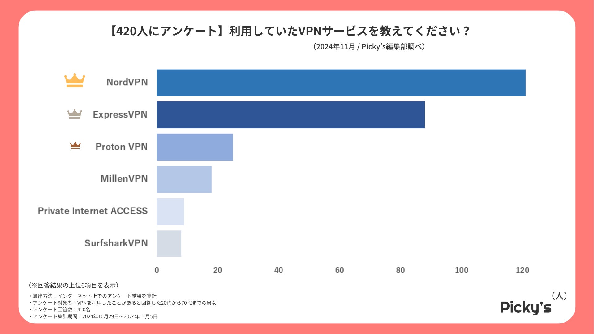 「Picky’s」は、インターネットショッピングにおいて、購入前に試せない・選ぶべきものがわからないという課題の解決を目標に、あらゆる商品・サービスのおすすめランキングや検証レビューを紹介するサイトです。このたびPicky’s(https://picky-s.jp/)では、VPNサービスについてインターネット上でアンケート調査を行いましたので発表いたします。
