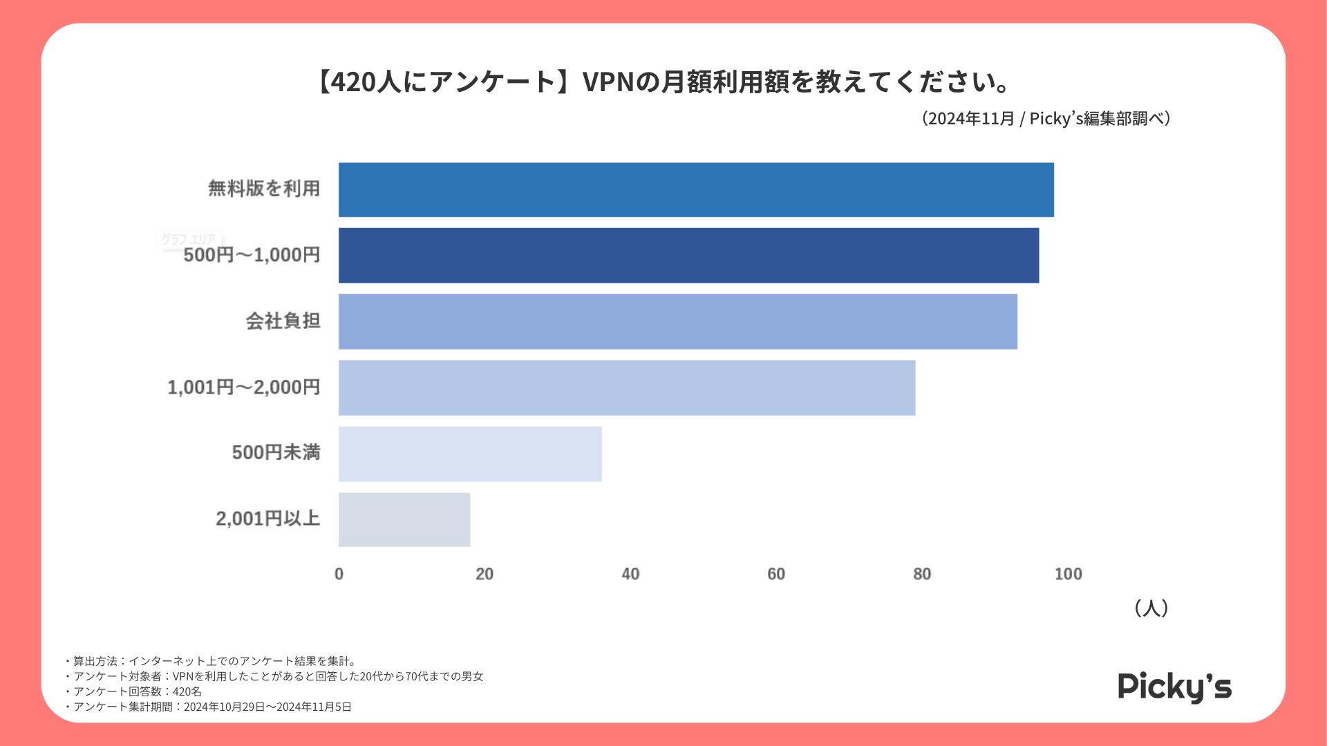 無料版や1000円以下のコスパの良いサービスを利用している方が多く、会社で契約しているVPNサービスを使用している方も25%ほど見受けられました。
