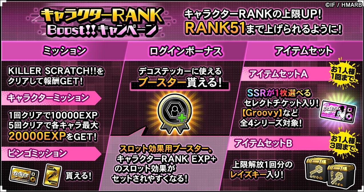 期間中、キャラクターRANK EXPを各キャラクター最大20,000獲得できるキャラクターミッションをはじめ、ビンゴミッションやログインボーナスを開催しています。ログインボーナスでは、デコステッカーに使用できる「ブースター」を獲得することができます。