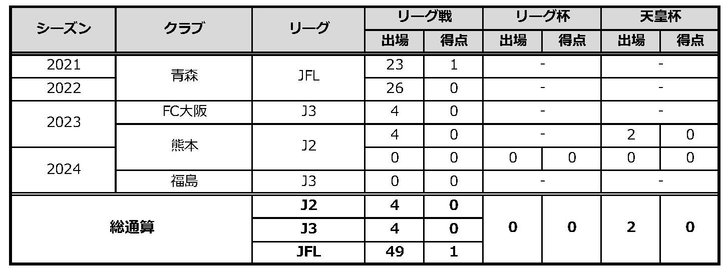 サッカー歴:ヴァンフォーレ甲府U-15→ヴァンフォーレ甲府U-18→産業能率大→ラインメール青森FC→FC大阪→ロアッソ熊本→福島ユナイテッドFC