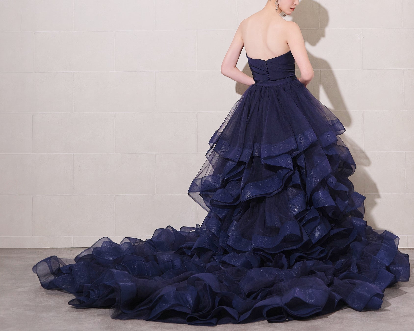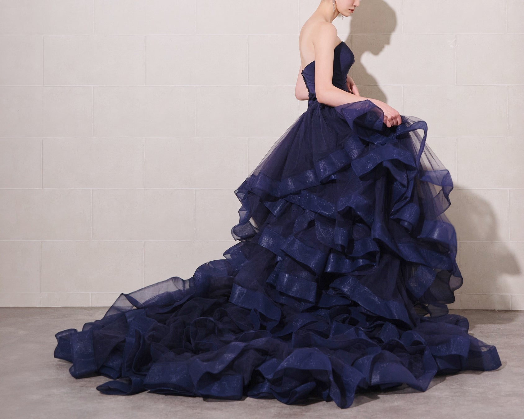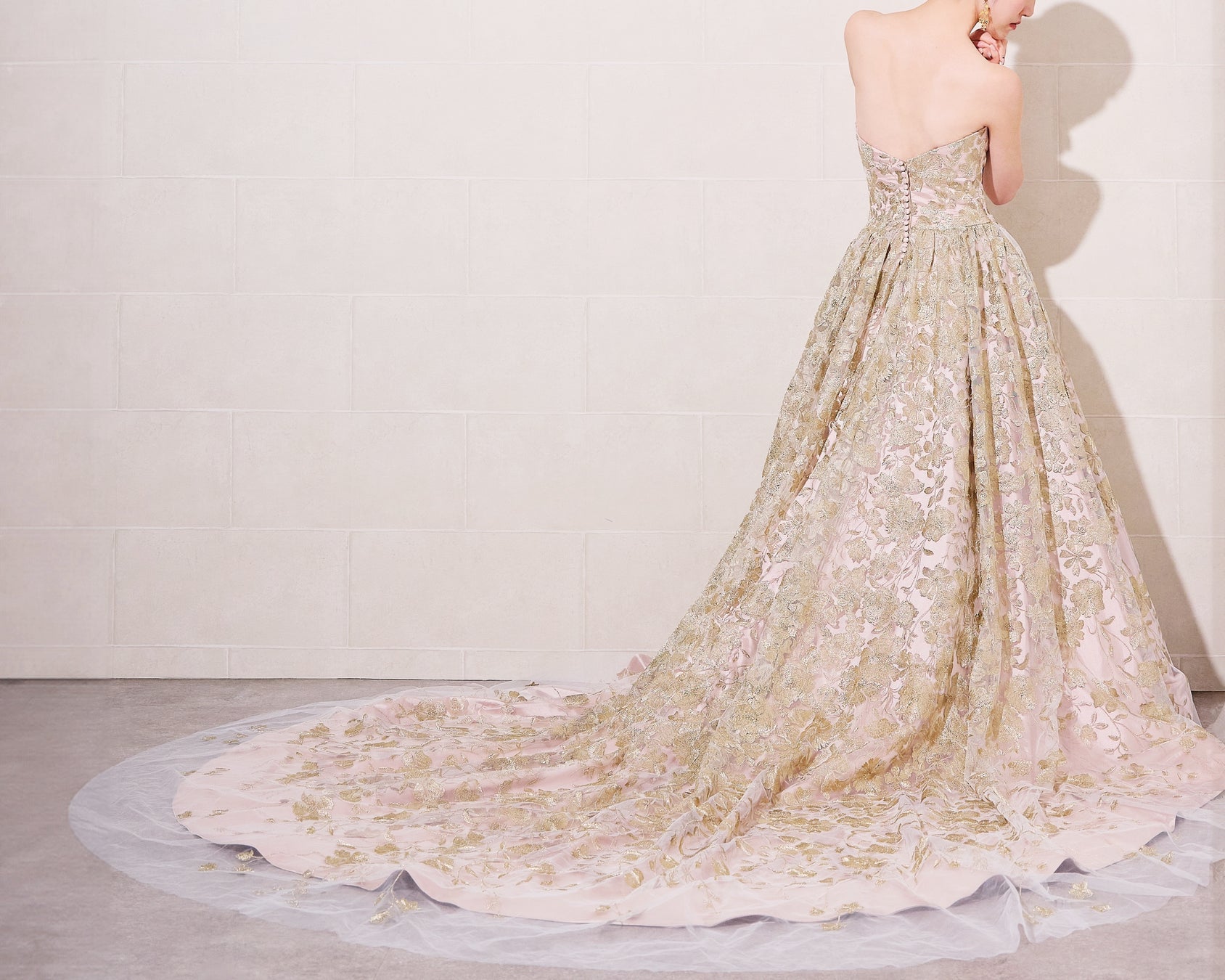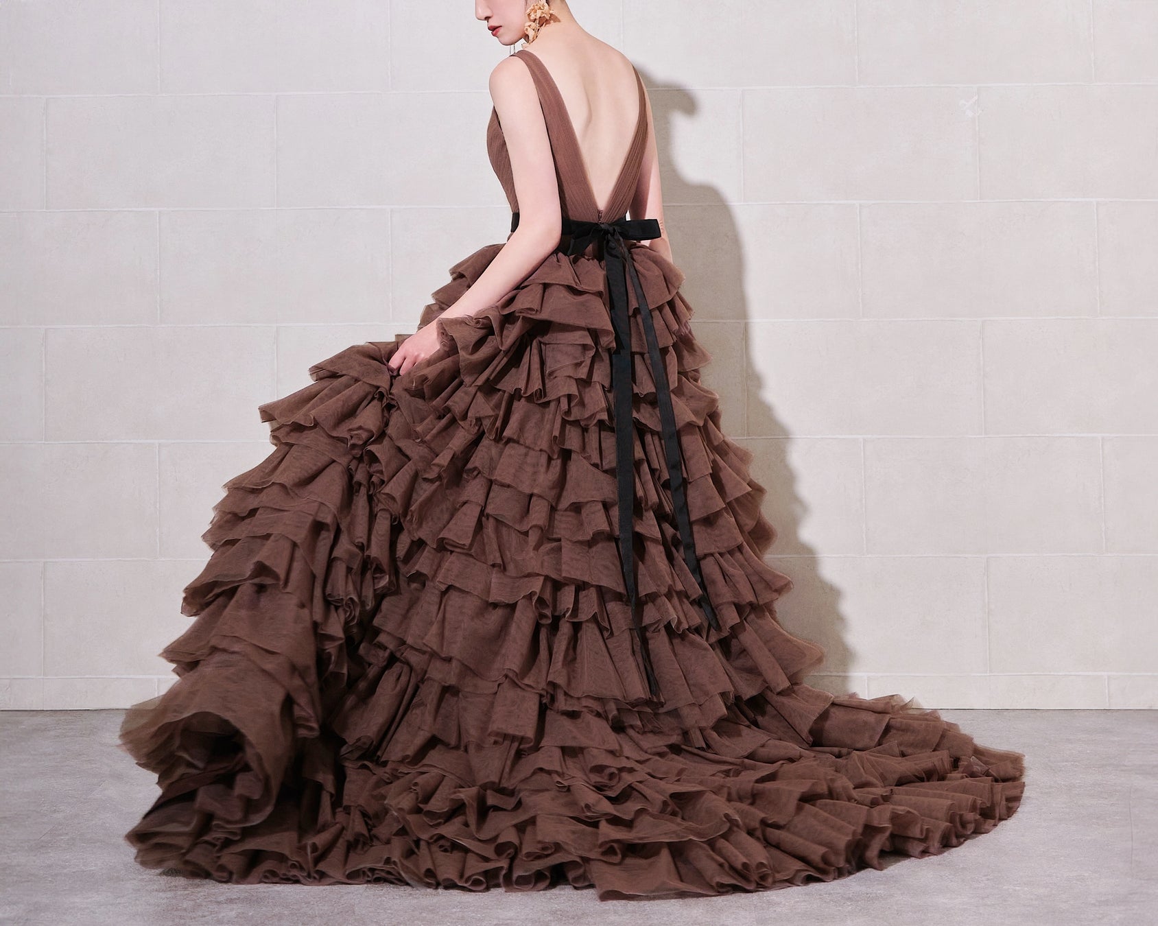 ・流行の細かなティアードスカートに、ベースのブラウンカラーに淡いベージュを重ねて作り上げた「ニュアンスブラウンカラー」を施しました。シックでモダンなのに、華やかな気品を感じる、目を引くカラーのドレスラインです。
