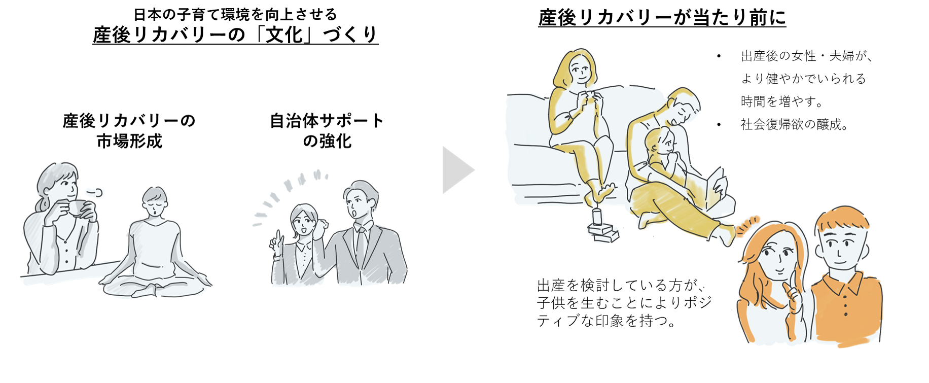 「産後リカバリープロジェクト」は、出産後のママやその夫婦の心身のリカバリー(=休養)に着目し、その文化や社会基盤を整えることで、日本の子育て環境を向上させ、‟産後リカバリー“という考え方が当たり前となるような社会を目指すことを目的に発足しました。