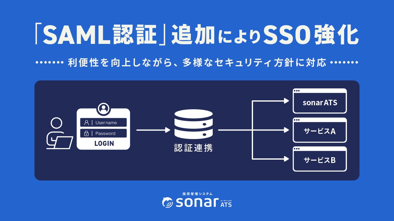 組織づくりのプラットフォーム「sonar HRテクノロジー」を展開するThinkings株式会社(シンキングス、本社:東京都中央区、代表取締役社長:吉田 崇)は、提供する「採用管理システムsonar ATS( https://hr.sonar-ats.jp/1106_saml )」において、シングルサインオン(SSO)を実現する方法として、新たに「SAML認証」機能をリリースしました。これにより、従来より提供していた「OIDC 認証」と併せて自社にとって最適な方法を選択し、「sonar ATS」にログインできるようになります。