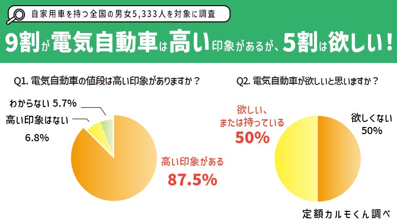個人向けカーリースサービス「おトクにマイカー 定額カルモくん」(以下、定額カルモくん)を提供するナイル株式会社(本社:東京都品川区、代表取締役社長:高橋 飛翔)は、自家用車を持つ全国の男女5,333人を対象に、「電気自動車の値段は高いと思うか」「電気自動車を欲しいと思うか」など電気自動車に対するイメージについてインターネット調査を実施しましたので、調査結果をお知らせいたします。