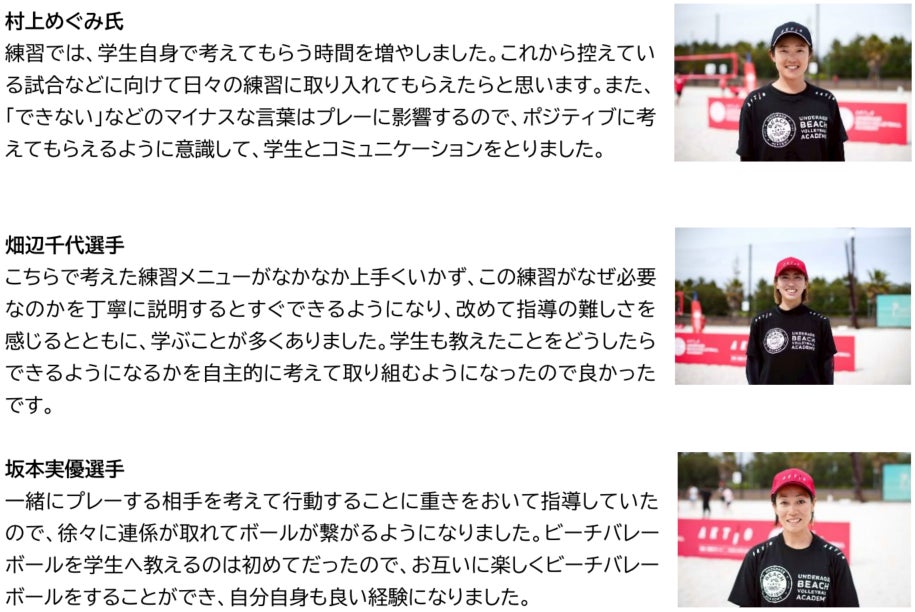今回の「AKTIO アンダーエイジ・ビーチバレーボール・アカデミー」vol.9では、現役のプロビーチバレーボール選手とプロコーチが、部活動でビーチバレーボールやインドアのバレーボールに取り組む中学生・高校生を対象に、試合での戦略や戦術、コンビネーション、勝利への考え方などについて実践形式で指導を行いました。練習試合を通じ、プロから直接アドバイスを受けることで参加した生徒達にとって貴重な経験となりました。