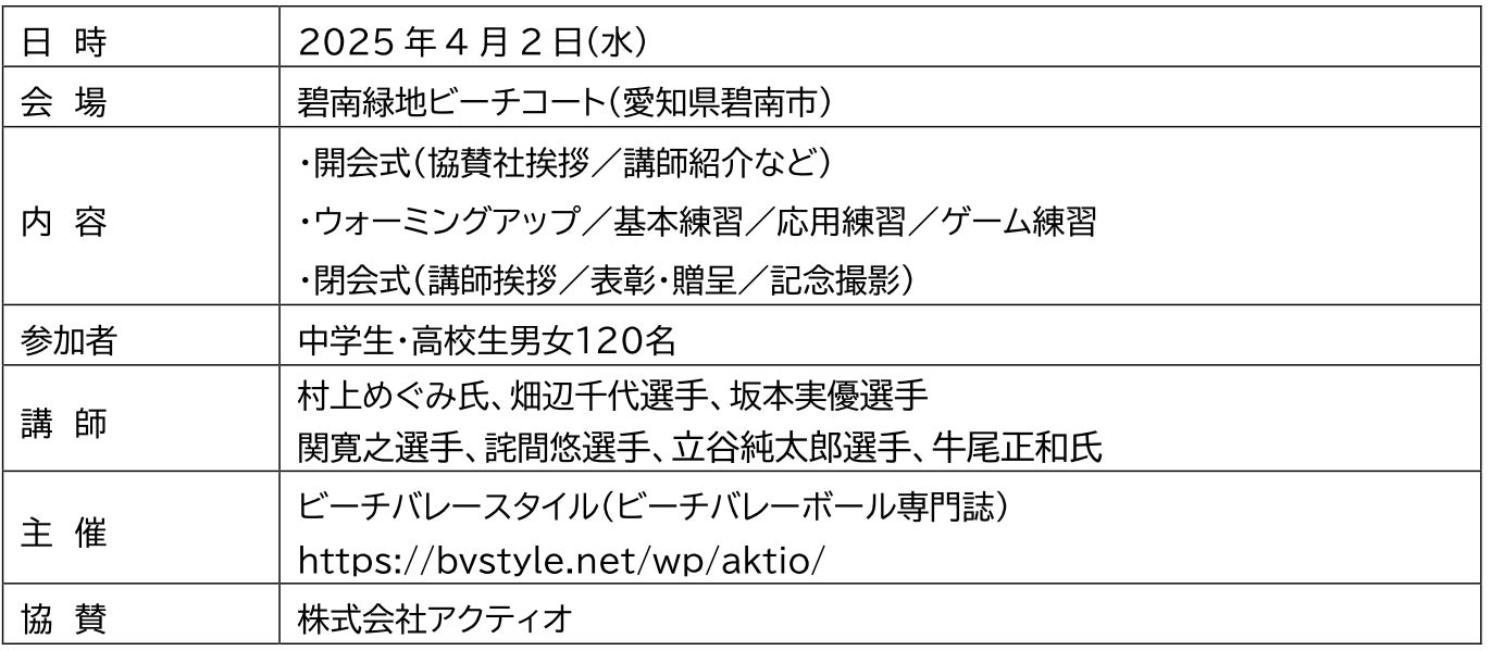 総合建設機械レンタルの株式会社アクティオ(本社:東京都中央区日本橋、代表取締役社長兼COO:小沼直人、以下アクティオ)は、ビーチバレースタイルが主催する、部活動でビーチバレーボールに取り組む中・高校生を対象にしたイベント「AKTIO アンダーエイジ・ビーチバレーボール・アカデミー」に冠協賛をしております。今回で9回目となるアカデミーを2025年4月2日(水)に碧南緑地ビーチコート(愛知県碧南市)で開催いたしました。