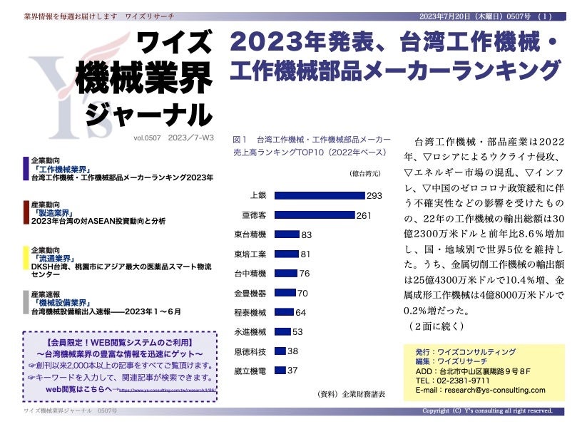 【台湾情報】2023年発表、台湾工作機械・工作機械部品メーカーランキング<ワイズ機械業界ジャーナル2023年7月第3週号発行>