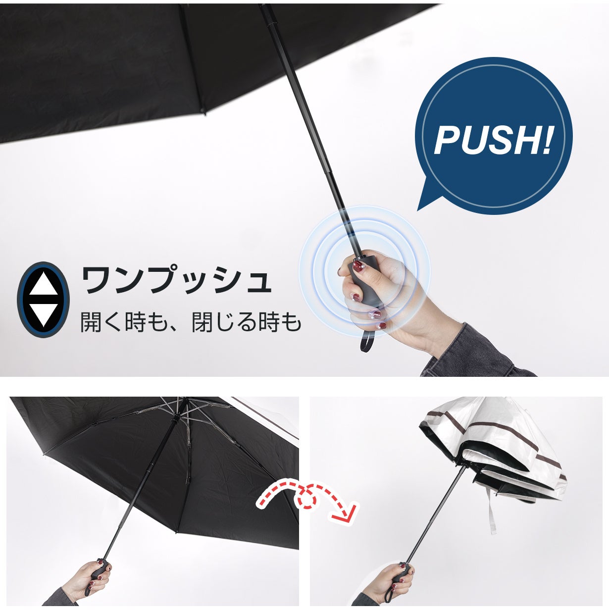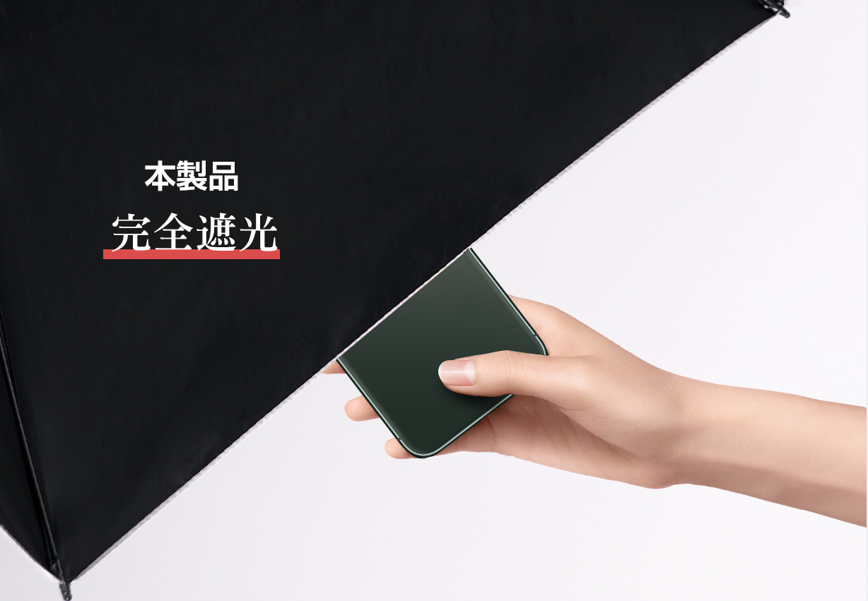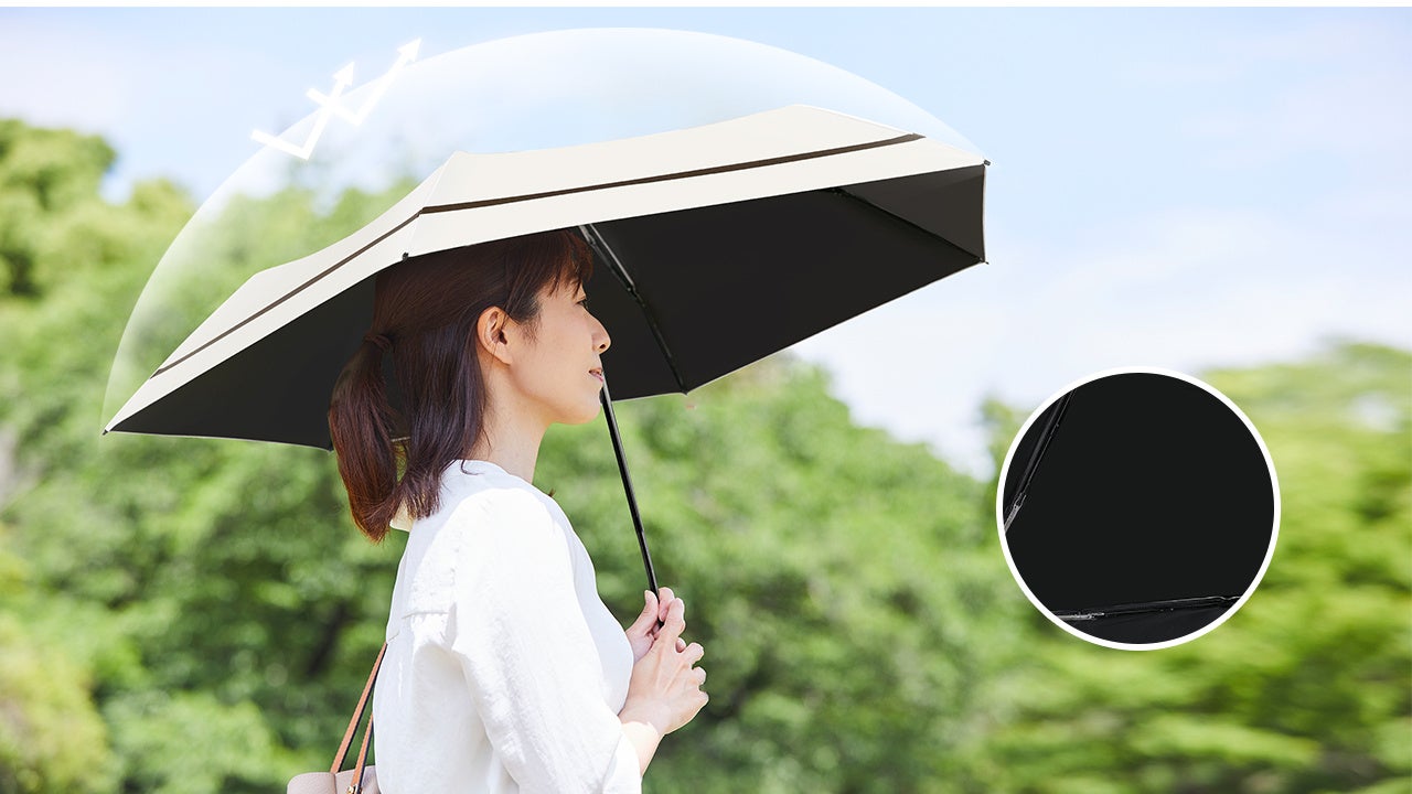 通常2層構造となっている日傘生地へのコーティングより、特殊な「3層構造」を採用しました。遮光率100%、遮熱率が55%以上、UPFが50+、UV CUT率が100%となる性能高い生地です。