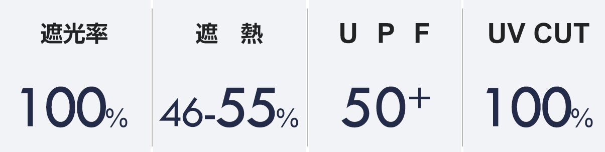 ◎遮光率100%、UVカット率100%、遮熱率55%、UPF50+と高水準の機能性!