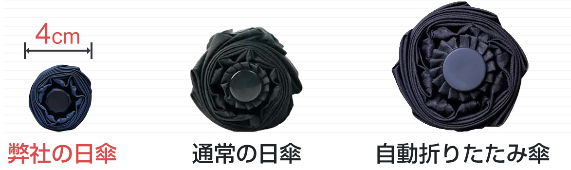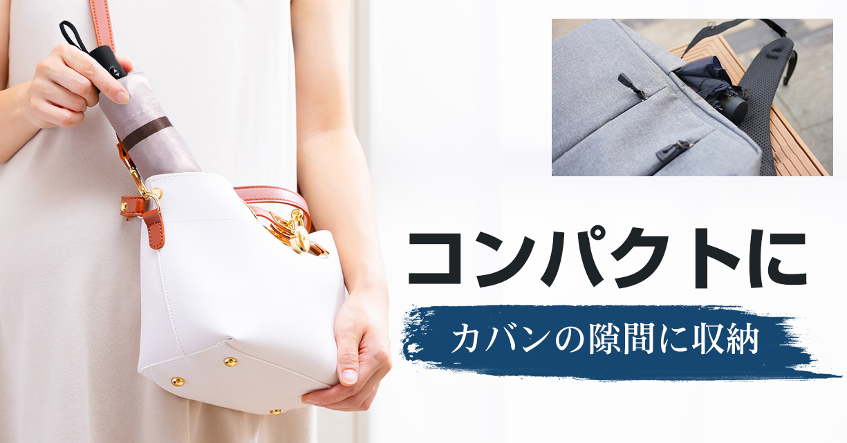 折り畳んだ際の直径は約4cmとスリムです。一般的な雨傘よりコンパクトで収納しやすく、持ち歩きやすいです。コンパクトに折りたためて、収納しやすいサイズです。カバンの隙間にポロっと入ります。