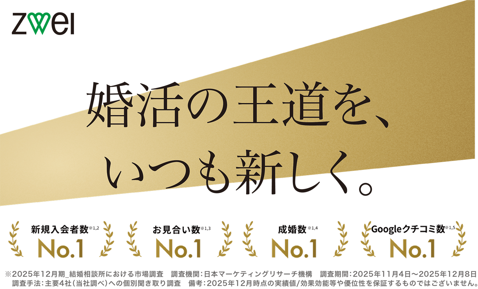株式会社ZWEI(ツヴァイ)(本社:東京都中央区、代表取締役社長:橋爪 みずほ、以下「ZWEI」)は、日本マーケティングリサーチ機構による市場調査において、「新規入会者数」・「お見合い数」・「成婚数」・「Googleクチコミ数」の4部門にてNo.1(*1)を獲得いたしました。