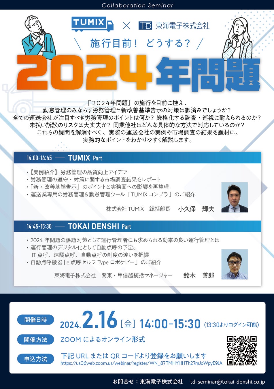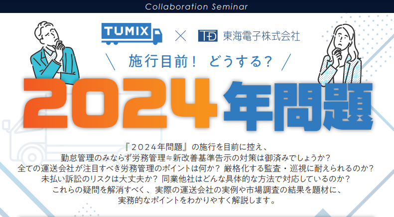 【株式会社TUMIX×東海電子株式会社 合同ウェビナー】施行目前!どうする?『2024年問題』2月16日(金)無料開催のご案内