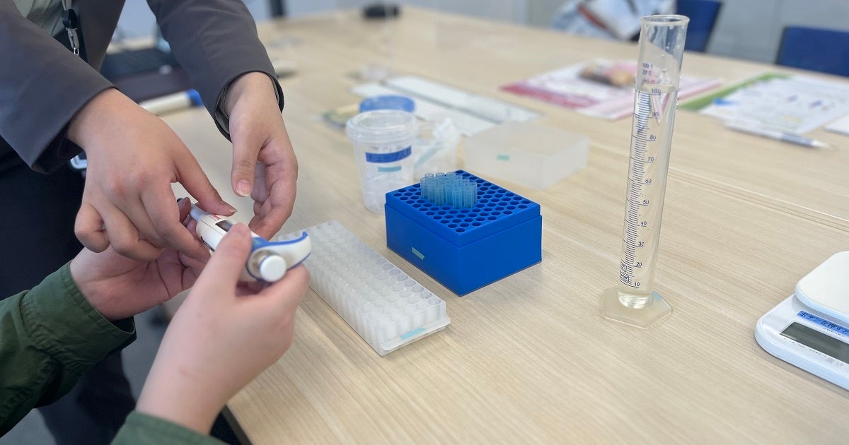 研修内容 | 【座学】20~30分 安全性や薬品の取り扱い方法、実験器具の説明など、実験の基礎を学ぶ 【実技】40~50分 (1)身近にある「塩」を薬品に見立てて計量し、水を混ぜて調整液を作る 仕事で実際に使用する機会が多い、計量器具を使って秤量のコツを学ぶ