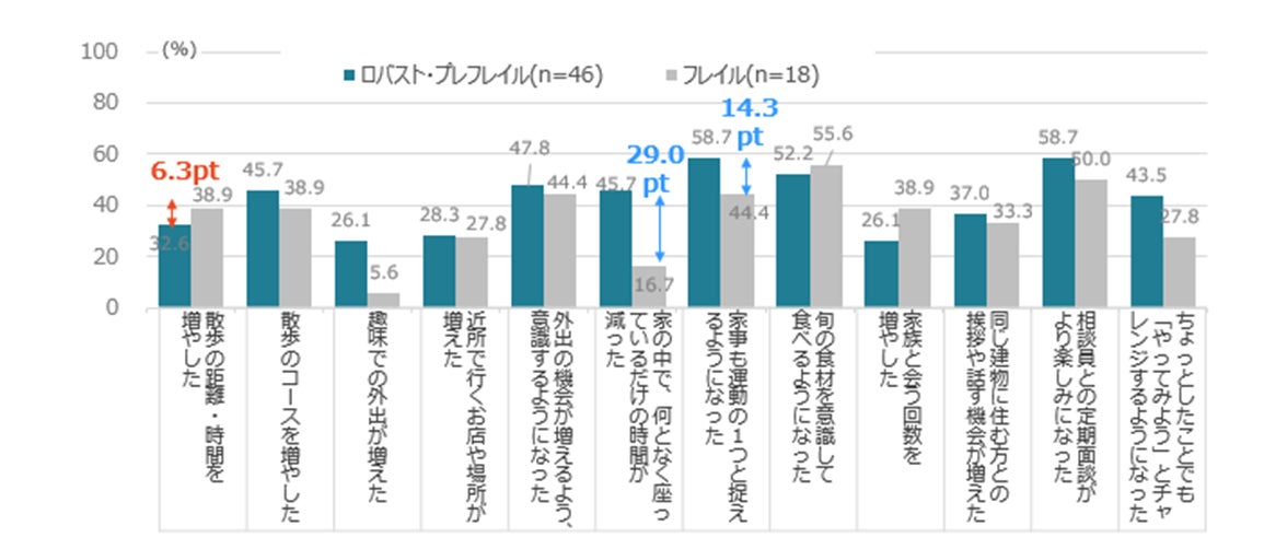 活動内容の変化についてロバスト・プレフレイルとフレイル(※2)に分けて「健康行動の工夫や意識の変化」を比べると、家の中でなんとなく座っている時間が減った方は、ロバスト・プレフレイルで45.7%、フレイルで16.7%、その差29.0pt。家事も運動の一つと捉えるようになった方も、ロバスト・プレフレイルで58.7%、フレイルで44.4%、その差14.3ptとなり、どちらもロバスト・プレフレイルの方が多い結果となりました。一方で、散歩の距離や時間を延ばした割合は、ロバスト・プレフレイルが32.6%、フレイルが38.9%、その差6.3ptとフレイルの方が多いということから、フレイル予防にとっては運動の「強度」よりも「頻度」がポイントと言えそうです。そのため、TVCMが流れるたびに立ち上がったりすることで座りっぱなしを防いだり、大掃除ではなくちょっとした掃除を増やす、ゴミを捨てに行く、などを運動と捉え日常の中で意識的に取り組むことがフレイル予防に効果があると考えられそうです。