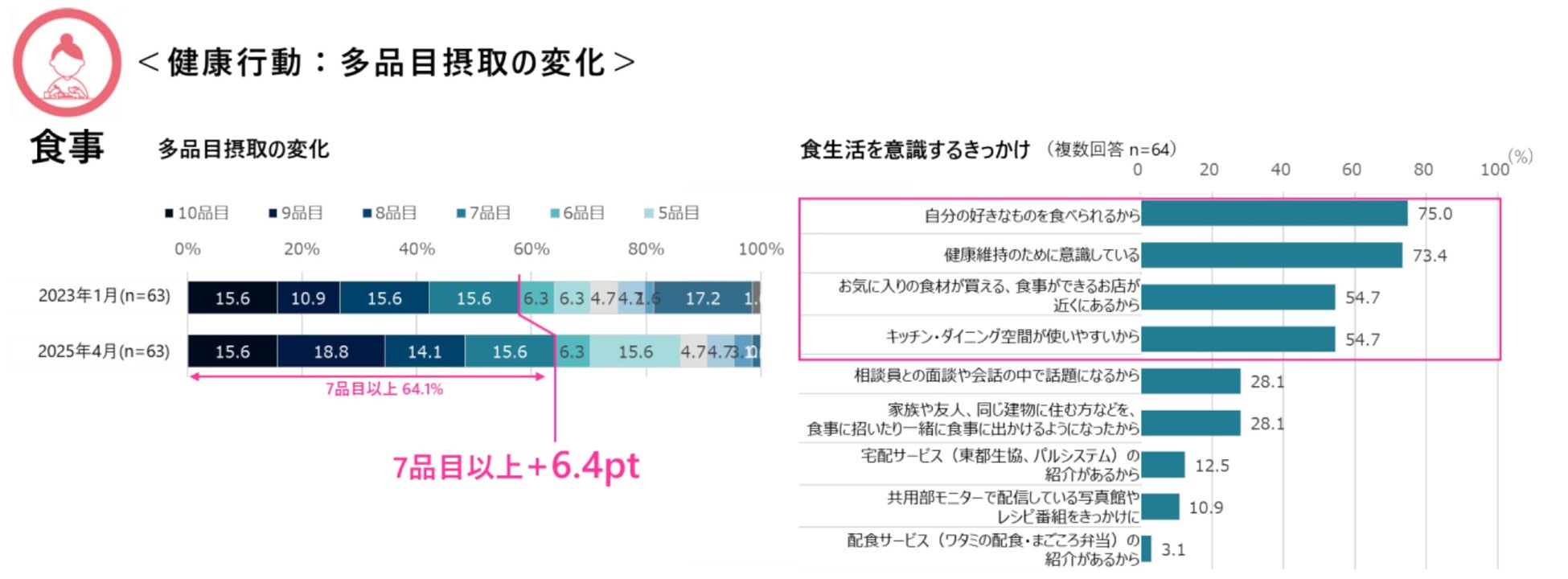 ② 食事:毎日の食事に欠かせない10食品群のうち7品目以上の多品目接種をしている方が6.4pt増加。自分で好きな食材を購入、調理し食べる生活が日常の食生活を楽しむきっかけになっています。