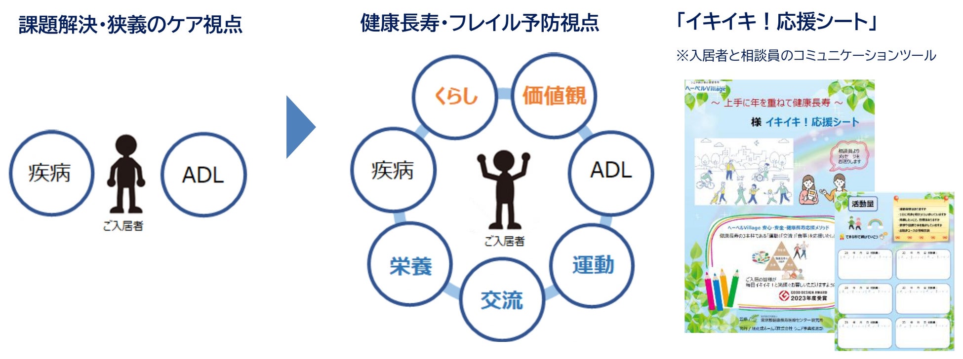 介護スタッフなどが常駐せず食堂を不要とした事業形態で、設計(安全な暮らしと活動・交流を促す住環境) × 相談員(定期的に入居者を見守りイキイキとした暮らしを後押しする人) × しかけ(設備による見守りと交流のきっかけ)の3つで入居者の暮らしを後押しし、入居者自らが健康長寿の3条件(活動量・食事・交流)の行動を増やし、健康長寿を実現することを目指します。