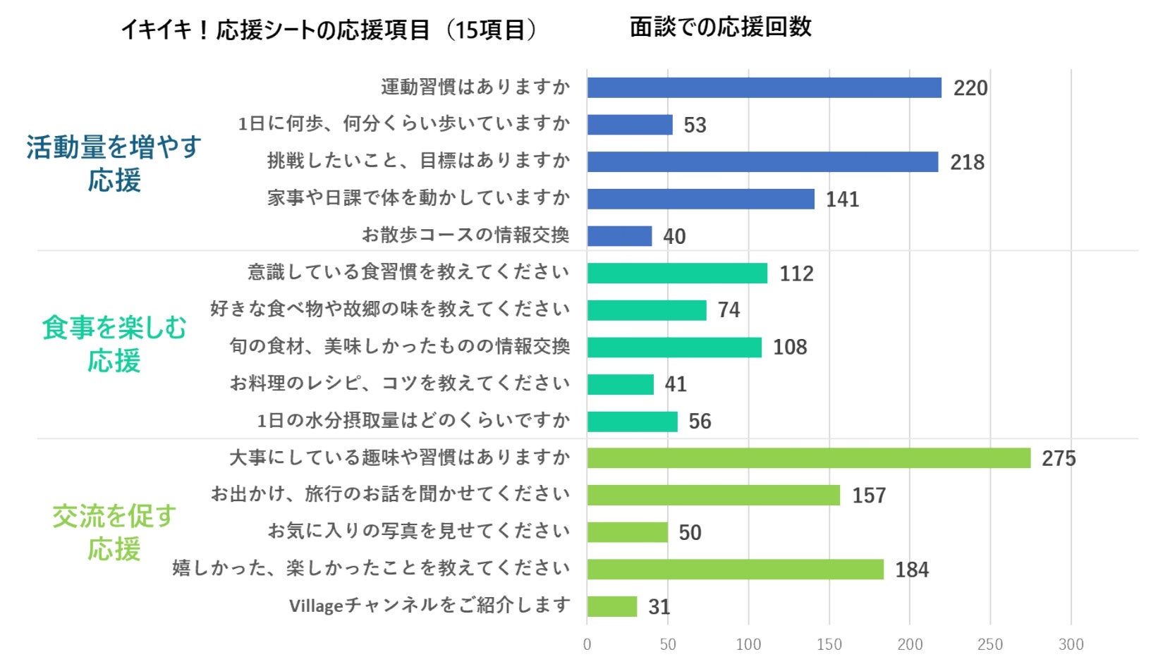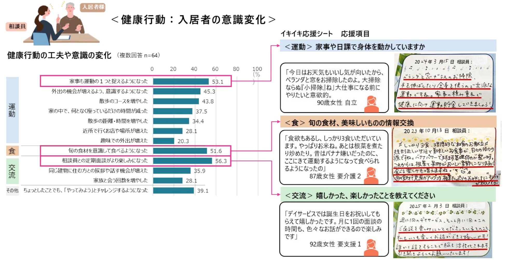② 家事も運動の一つととらえる、旬の食材を意識して食べる、相談員との定期面談が楽しみになった、など相談員の応援や勧めによって、入居者に工夫や意識の変化がみられ、健康行動の質が変わったことが分かりました。