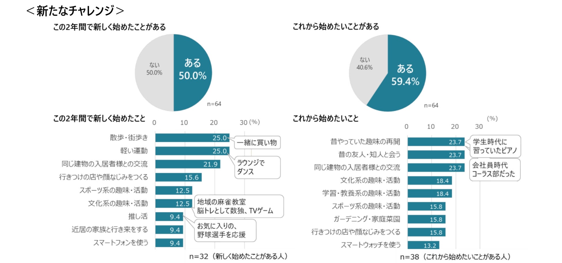 ① この2年間で新しいことを始めた方は50.0%、これから始めたいことがある方は59.4%となり、平均年齢83歳のヘーベルVillage入居者が新たなチャレンジをする意欲を持ち続けている実態が分かりました。