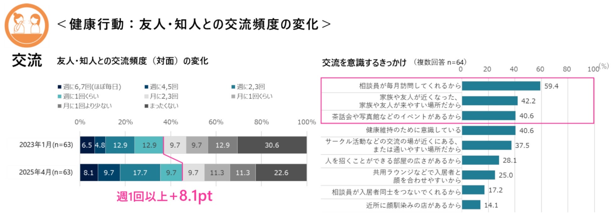 ③ 交流:年齢を重ねることで減少しやすい友人・知人との対面交流を週1回以上している方が8.1pt増加。相談員の訪問も交流と捉え、ラウンジで開催する茶話会や写真館などのイベントは入居者同士の交流のきっかけになっています。