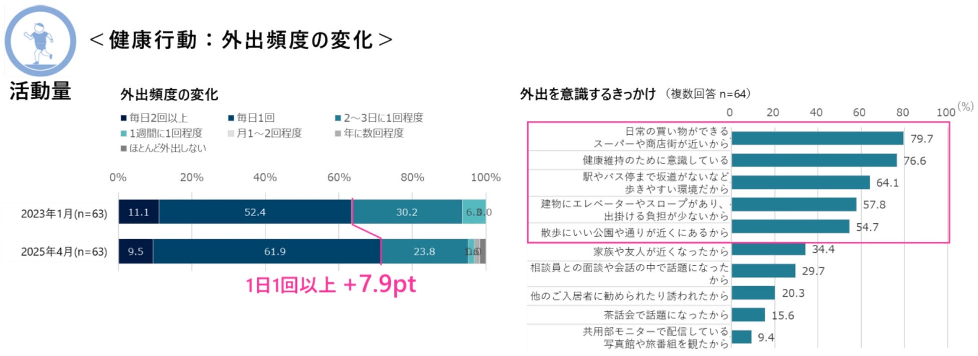 ① 活動量:買い物・散歩、習い事、家族・友人とのお出掛けなどで、1日1回以上外出している方が7.9pt増加。スーパーや公園が近い、駅まで坂がない等の出掛けやすい立地、エレベーターやスロープで出掛ける負担が少ないことが外出のきっかけになっている実態が明らかになっています。